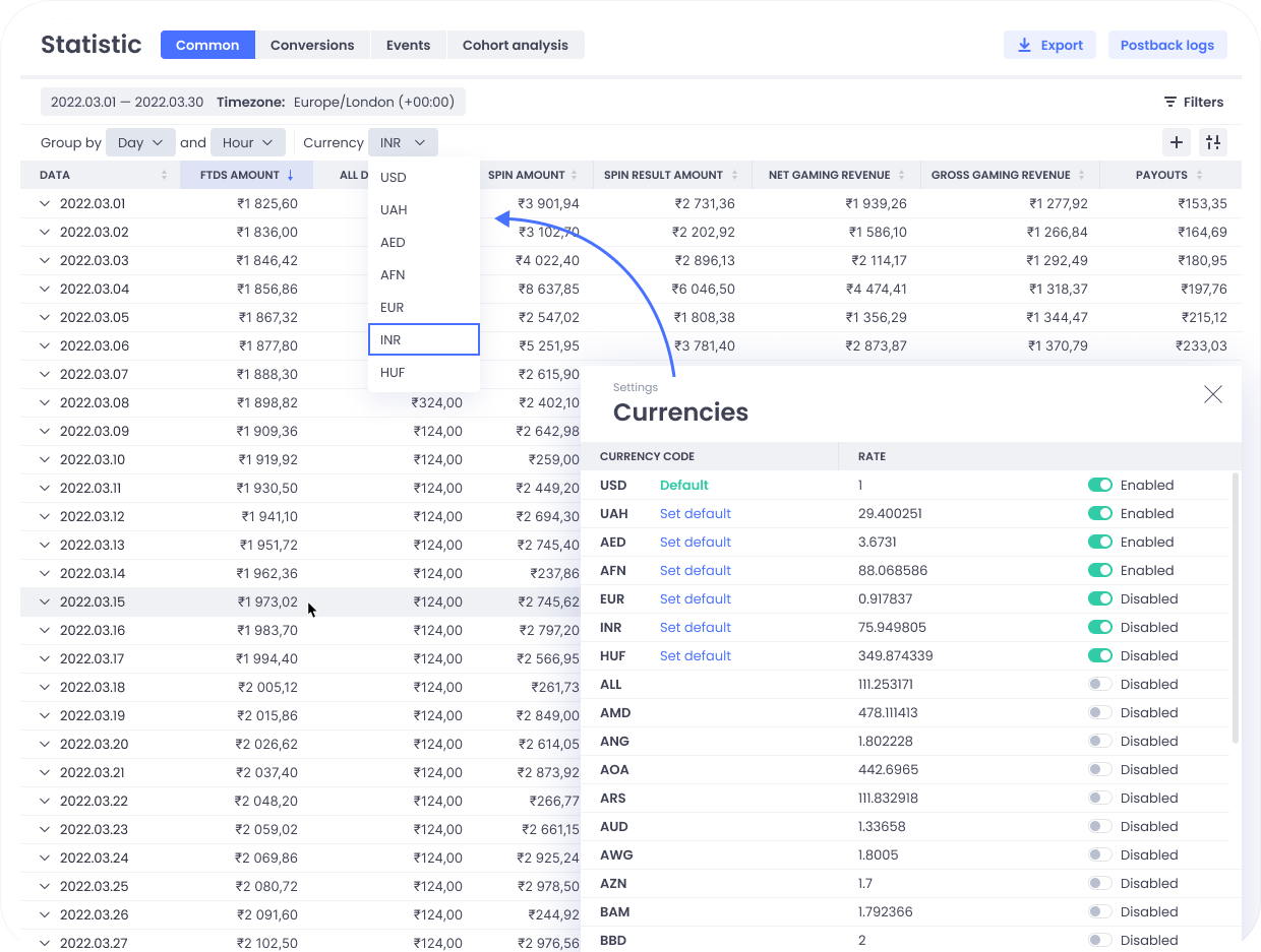 With Alanbase, you will receive a flexible payout module: convert statistical indicators and process payments with just 2 clicks.